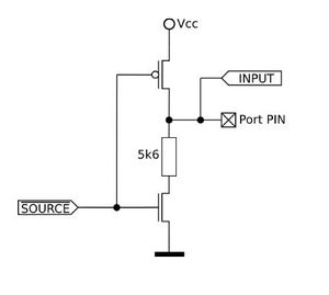 V tomto móde je v log.1 pin ťahaný k napájaciemu napätiu cez rezistor(preto pull-up), v log.0 je pripojený priamo k zemi.Pri použití tohto módu ako vstupného, musí byť naň zapísaná log.1.