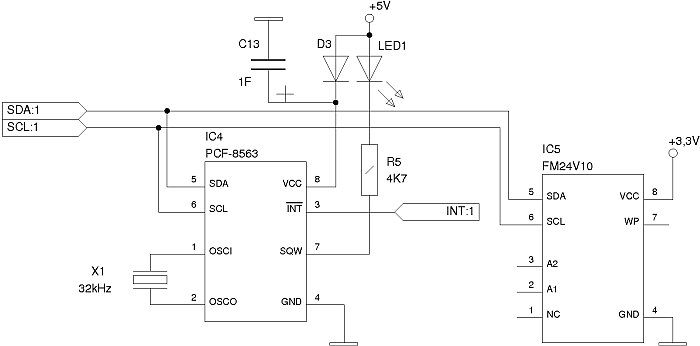 Na Obr. 4.6 je zapojenie RTC PCF8563 a F-RAM pamäti FM24V10. Zapojenie SDA a SCL vodičov je rovnaké pre oba integrované obvody. Pri RTC je potrebné medzi piny 1 a 2 zapojiť 32,768 kHz kryštál a pri návrhu dosky plošných spojov rozšíriť plôšky podľa odporúčania výrobcu. Na vizuálnu kontrolu funkčnosti RTC je na pin 7 pripojená LED1 s rezistorom R5 napájaná napätím 5 V. Pin 3 je pinom prerušenia, ktoré je vyvolané alarmom alebo ukončením odpočítavania a je pripojený k pinu kontroly prerušenia na mikroprocesore. Pri zapojení RTC je odporúčané do zapojenia zahrnúť aj záložnú batériu alebo veľkokapacitný kondenzátor, aby pri náhodnej poruche nedošlo k strate časových údajov v RTC. Aj keď sa v našom zapojení počíta s napájaním zo zálohovaného napájacieho zdroja, na zálohovanie RTC je použitý veľkokapacitný kondenzátor C13.